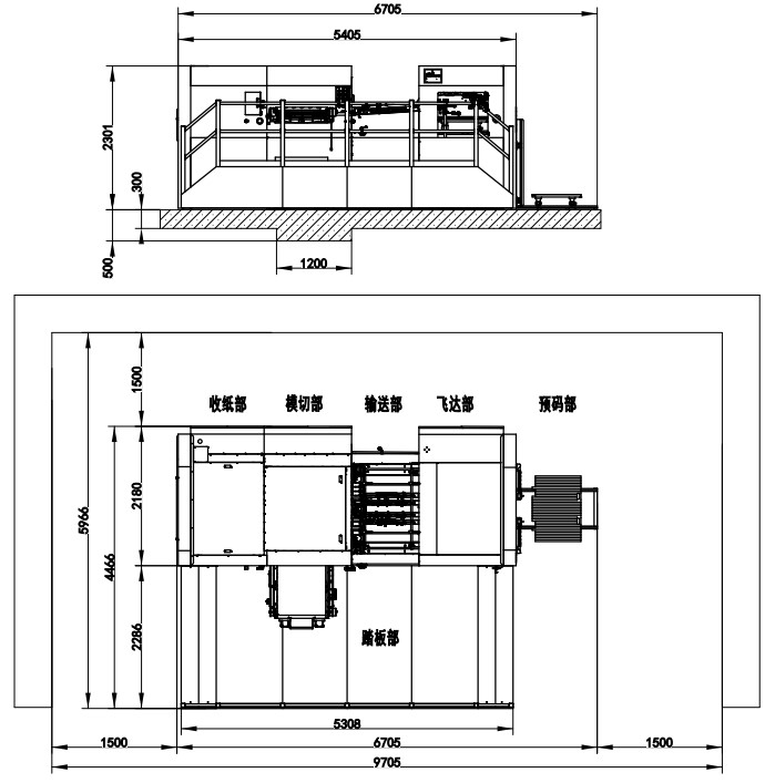| Machine Dimensions (Including Die Preloader) | 6705×5366×2301mm (L×W×H) (L: paper prepared track included, W: platform included) |