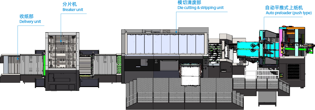 Converting System Integration means devices combined in line to reduce the manual work, optimize and speed up the flow of products within a single process. Among different modes of production lines, it is the most popular and practical mode in the global market with higher stability. In this system, the automatic prefeeder is one important part linked with the feeder of automatic diecutter to raise feeding efficiency and relieve the workload of operator at maximum that manual work cannot totally reach. The automatic breaker in line with the delivery unit of diecutter automatically separates blanks from multiple ups and save considerable labor costs compared to manual work. Along with the advantages in efficiency and cost, the system is especially able to be customized at particular client demands, products techniques and processes. Nowadays this sytem has become the new tendency interested by a large number of brand owners in the corrugated board packaging industry.