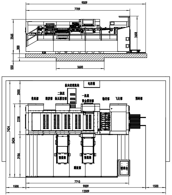 | Machine Dimensions(Including Die Preloader) | 9009×7424×2658mm (L×W×H) (L: paper prepared track included, W: platform included) |